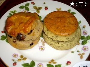 スコーンはネットの評判どおりしっとり系。見ての通り、左がクランベリー&シナモンで右がアールグレイ。