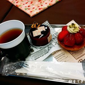 イートインでは、いちごのタルトとカシスとバニラのムース食べてみました。ちなみに紅茶(アールグレイ)がセットでついてきます。